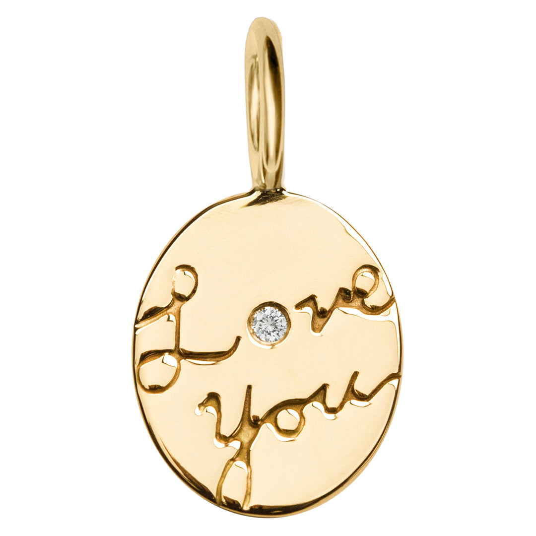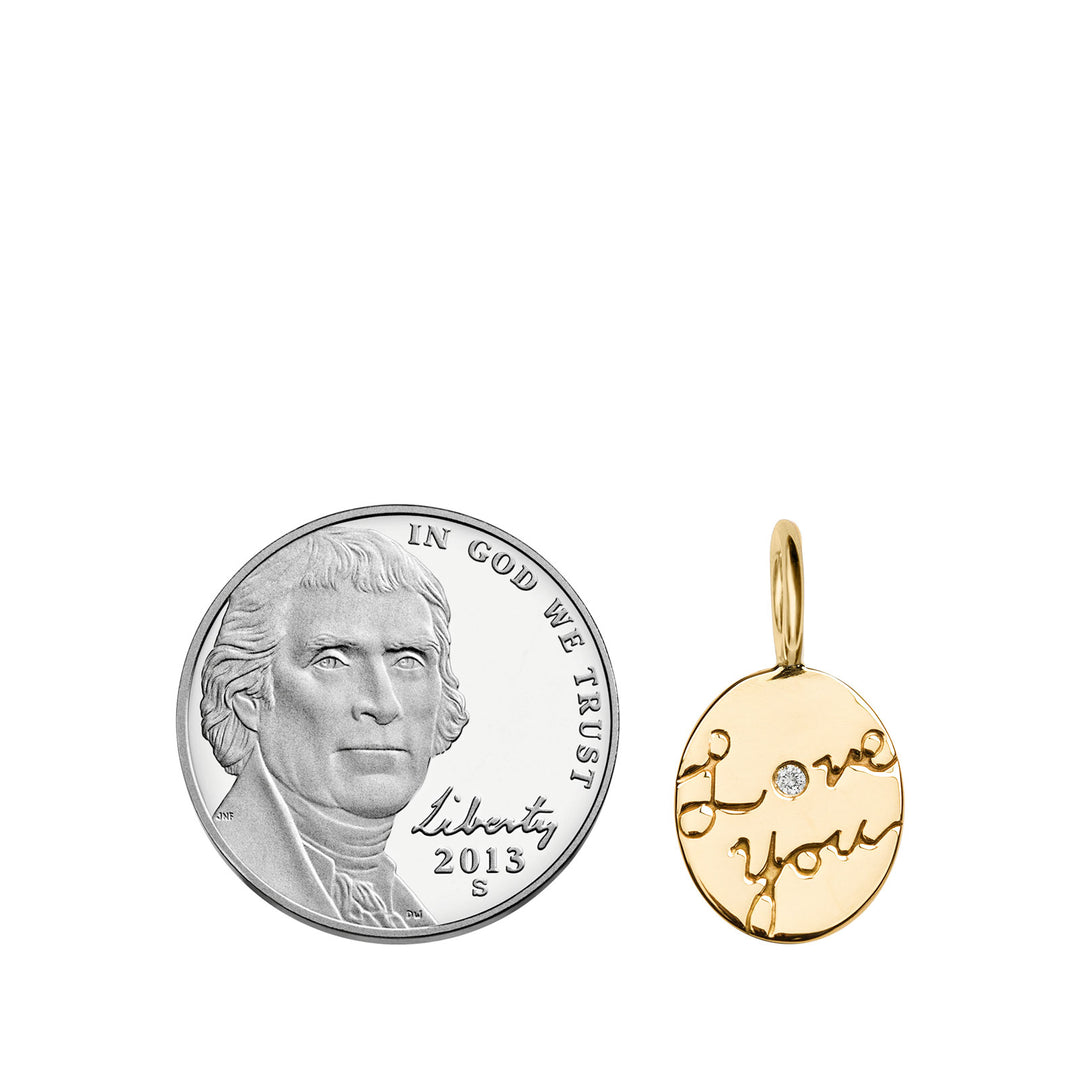 Show off your love with our Gold Love You Oval Charm. Made with 14k yellow gold and a stunning white diamond, this charm is the perfect touch of elegance and affection. The high polished finish adds a touch of shine to any outfit. Bonus points for wowing your partner with this charm!