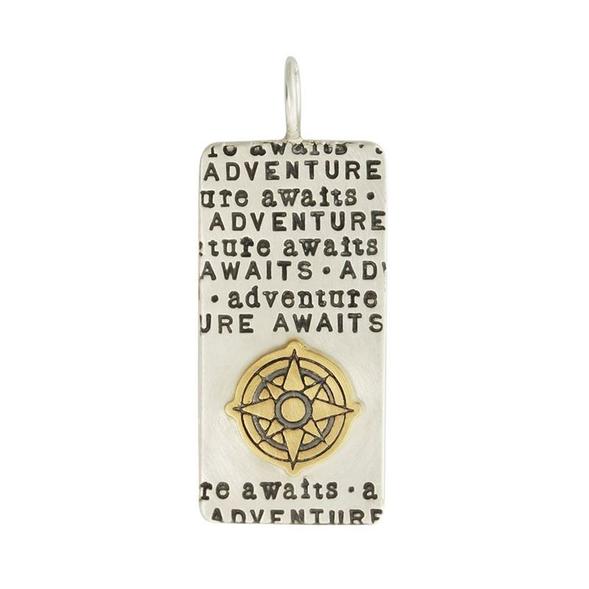 Heather B. Moore medium sterling silver ID tag with a yellow gold compass rose. Hand stamped with "Adventure Awaits" multiple times.