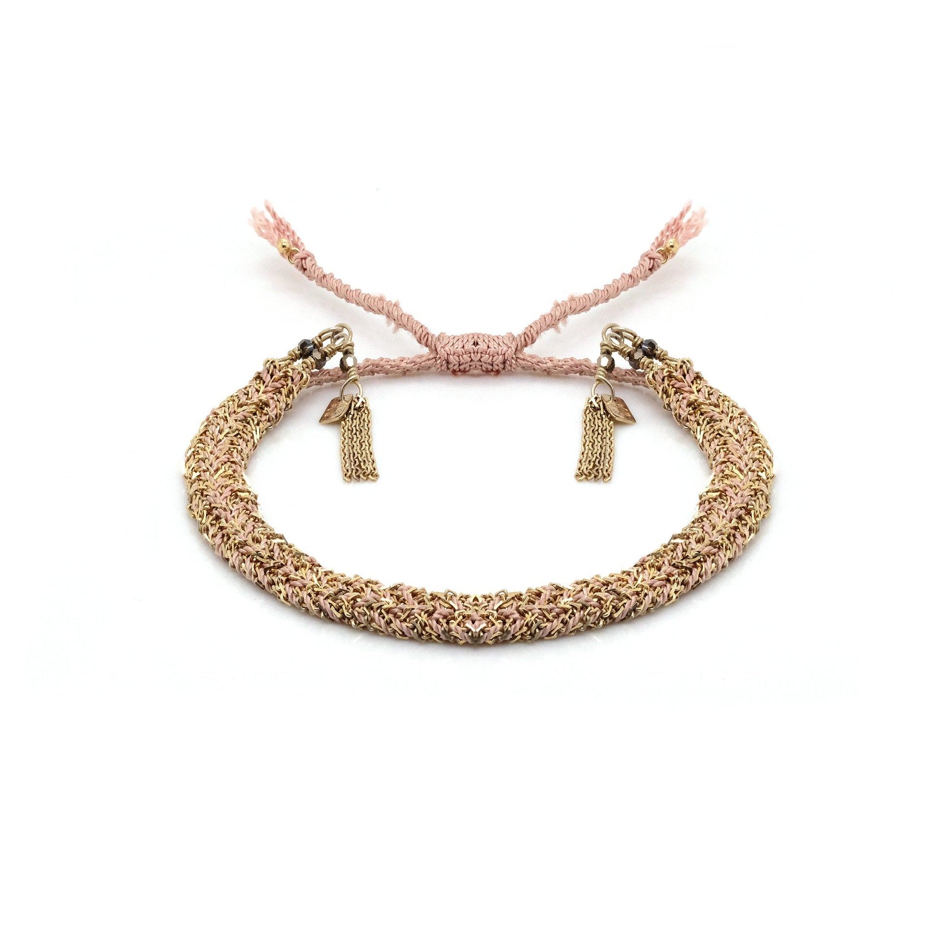 Marie Laure Chamorel - Hand-braided bracelet with forced Sterling silver chains and twisted nude color silk yarn finished by little chain fringe and tiny crystal beads. All parts are dipped in yellow gold.