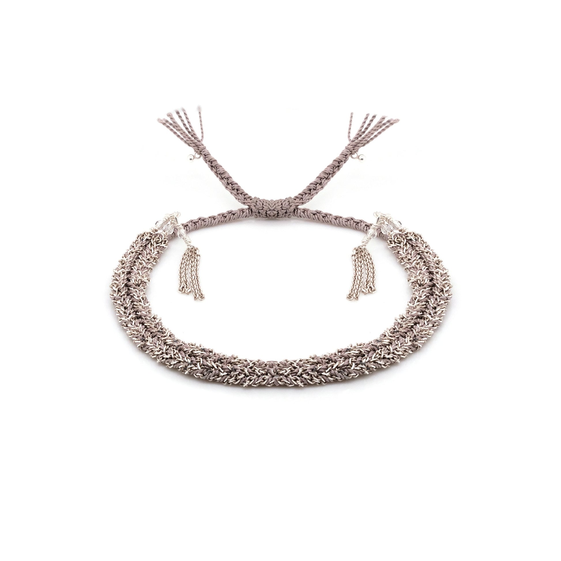 Marie Laure Chamorel - Hand-braided bracelet with forced Sterling silver chains and twisted nude color silk yarn finished by little chain fringe and tiny crystal beads. All parts are dipped in yellow gold.