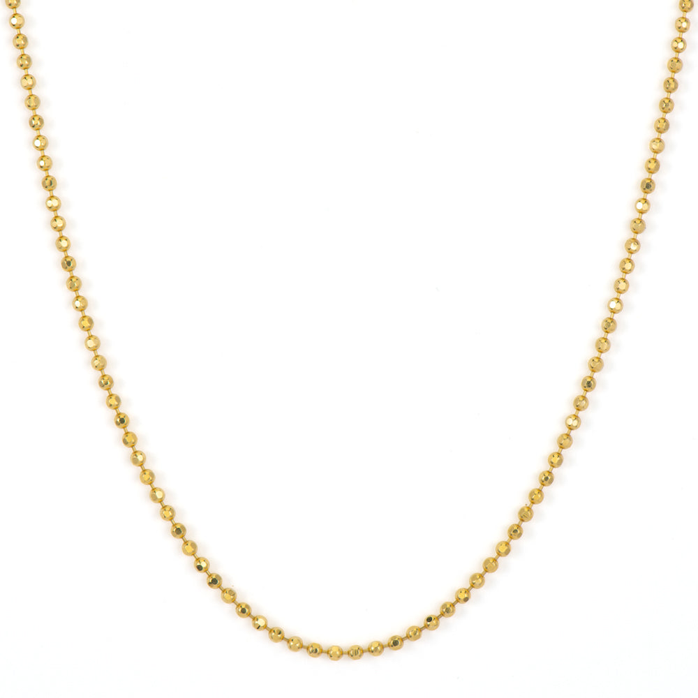 The Classic Small Beaded Chain from Three Stories Jewelry is perfect on it's own or with a Three Stories pendant or charm dangling from it. This classic chain is made from 14k yellow gold beads and features a Three Stories tag with one sparkling diamond.