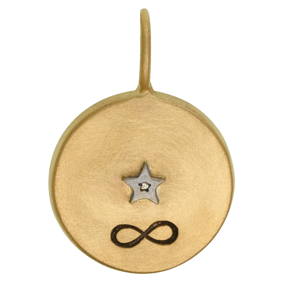This handmade round charm is the perfect piece to capture your adventurous spirit. Crafted from 14k yellow gold and a yellow gold frame, the compass rose features directional markers of NESW on the frame. Adorned with white diamonds, plus a 14k white gold open star & infinity symbol stamped on the back, this charm will surely be a conversation starter.