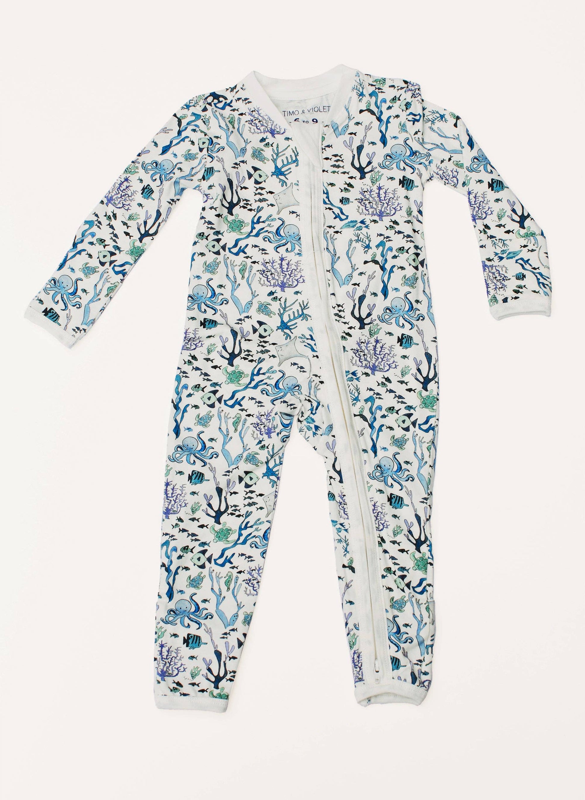 A soft essential, thoughtfully designed. This one-piece in our signature Coral Reef print is as practical as it is charming. Made for comfort and ease, it features fold-over hand mittens (up to size 9–12 months) to help prevent scratches, convertible foot cuffs for room to grow, and a double zipper for quick, no-fuss diaper changes. Everyday ease, with a little extra joy.