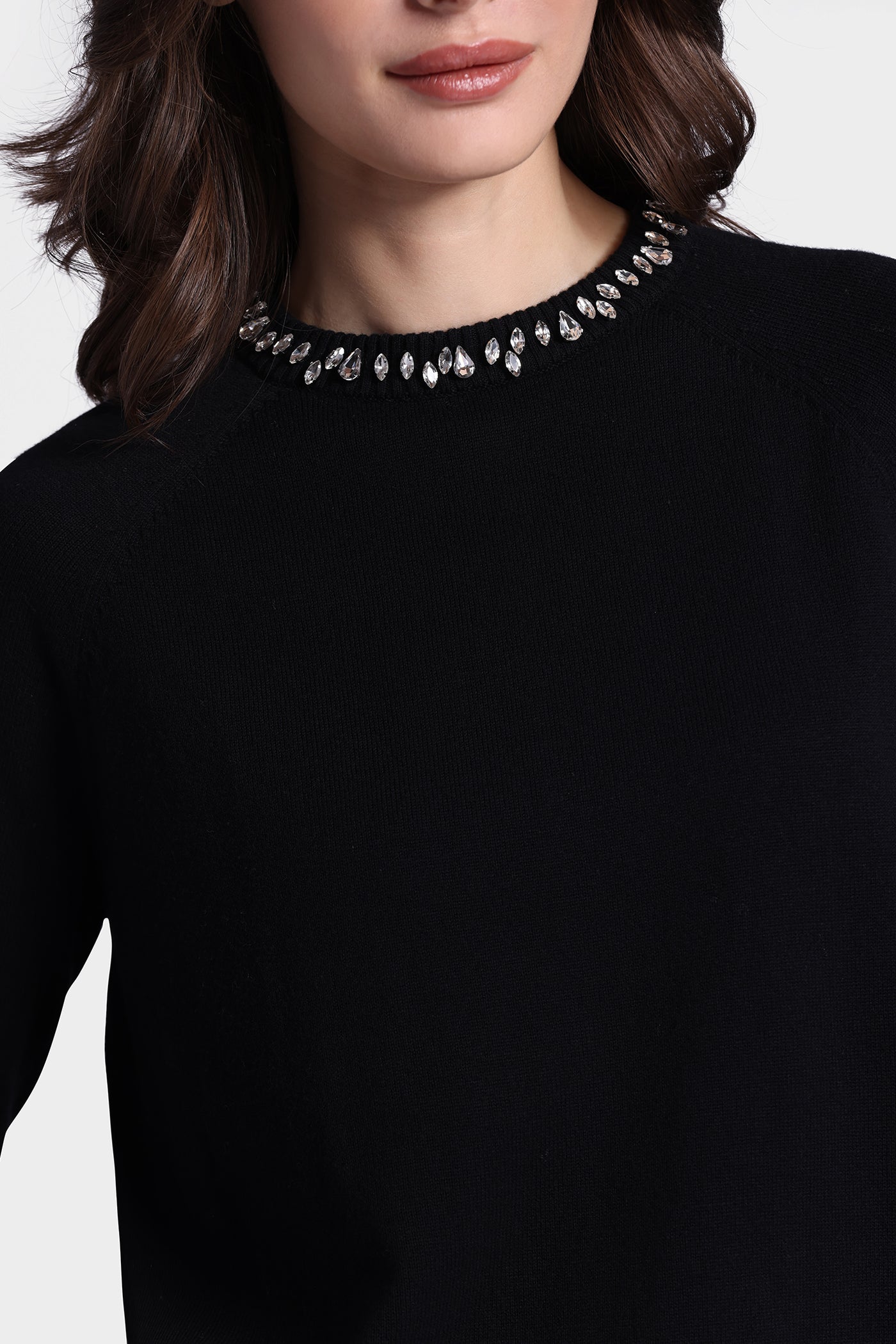 Cotton Cashmere Raglan Crew Jewel Neck Sweater - Black