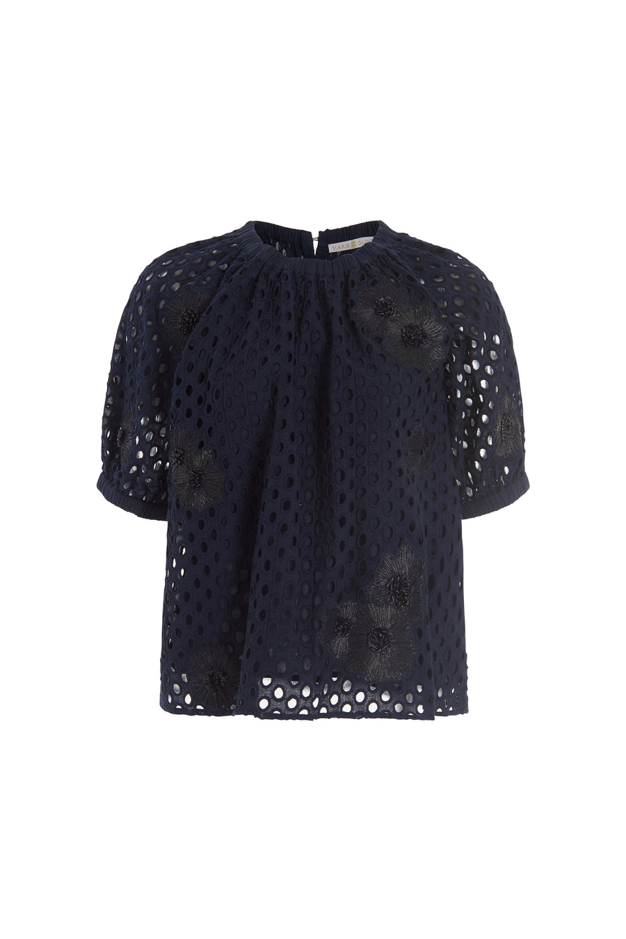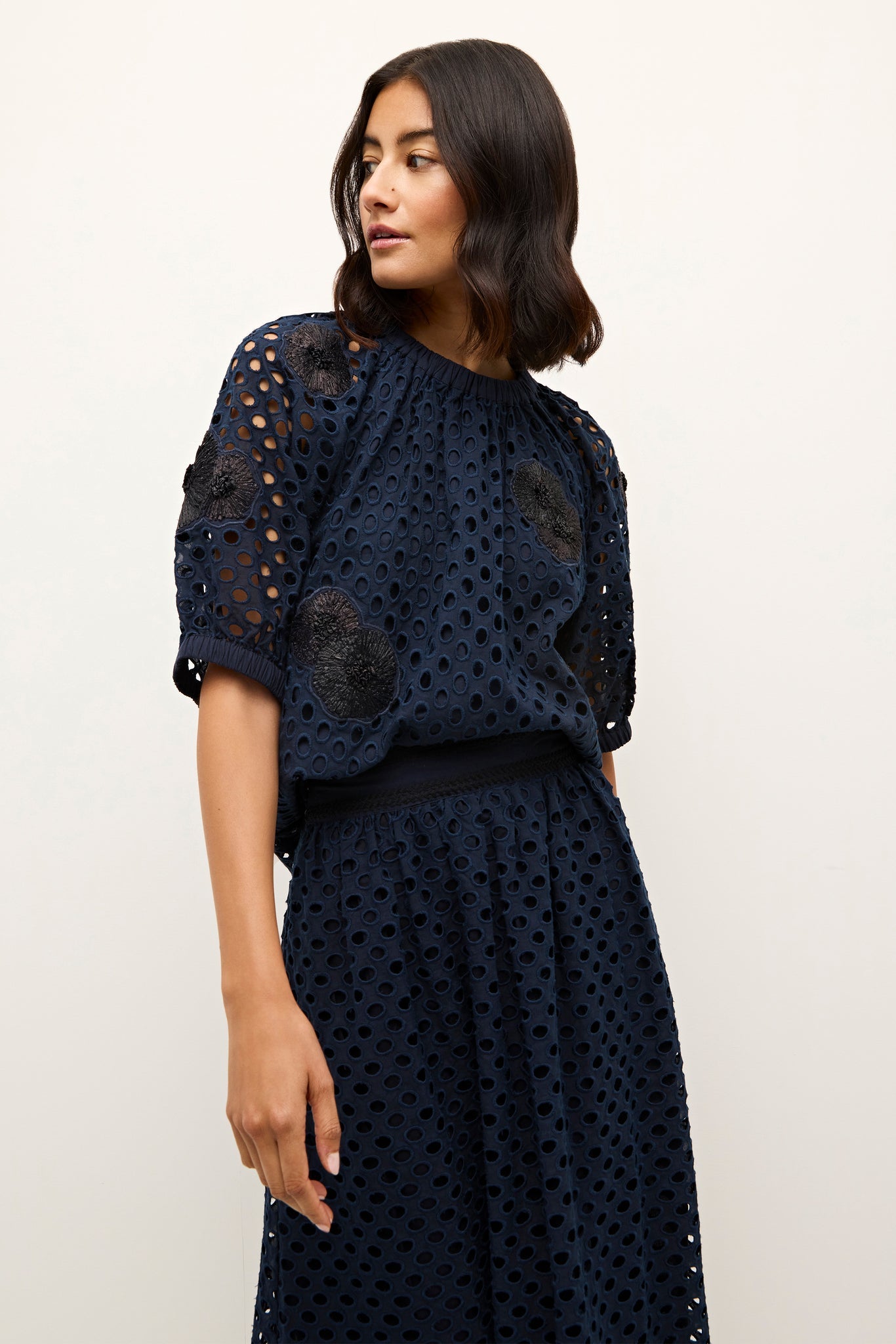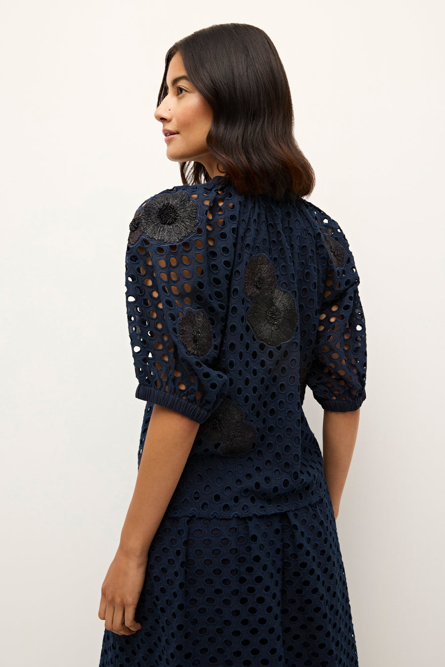 Midnight blue and black is the classically chic combo we don’t wear often enough. The timeless pairing gets an extra dose of sophistication and style with our new Doro top, which features an indigo eyelet fabric dotted with black raffia embroidered flowers.
