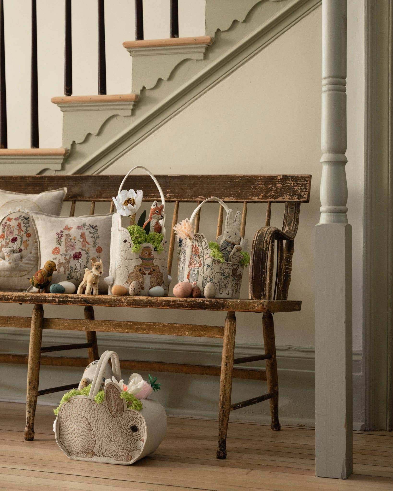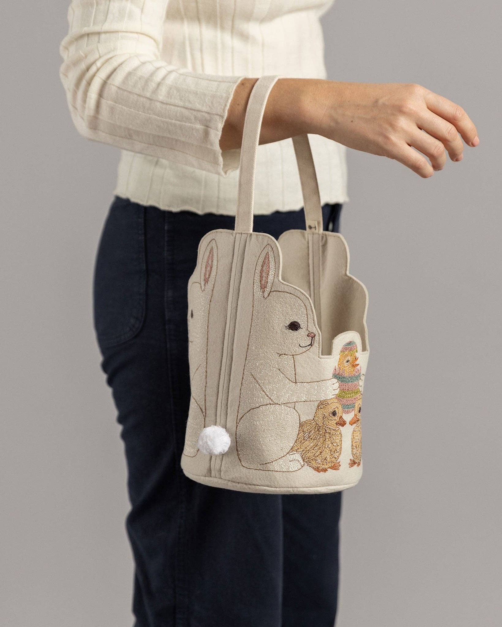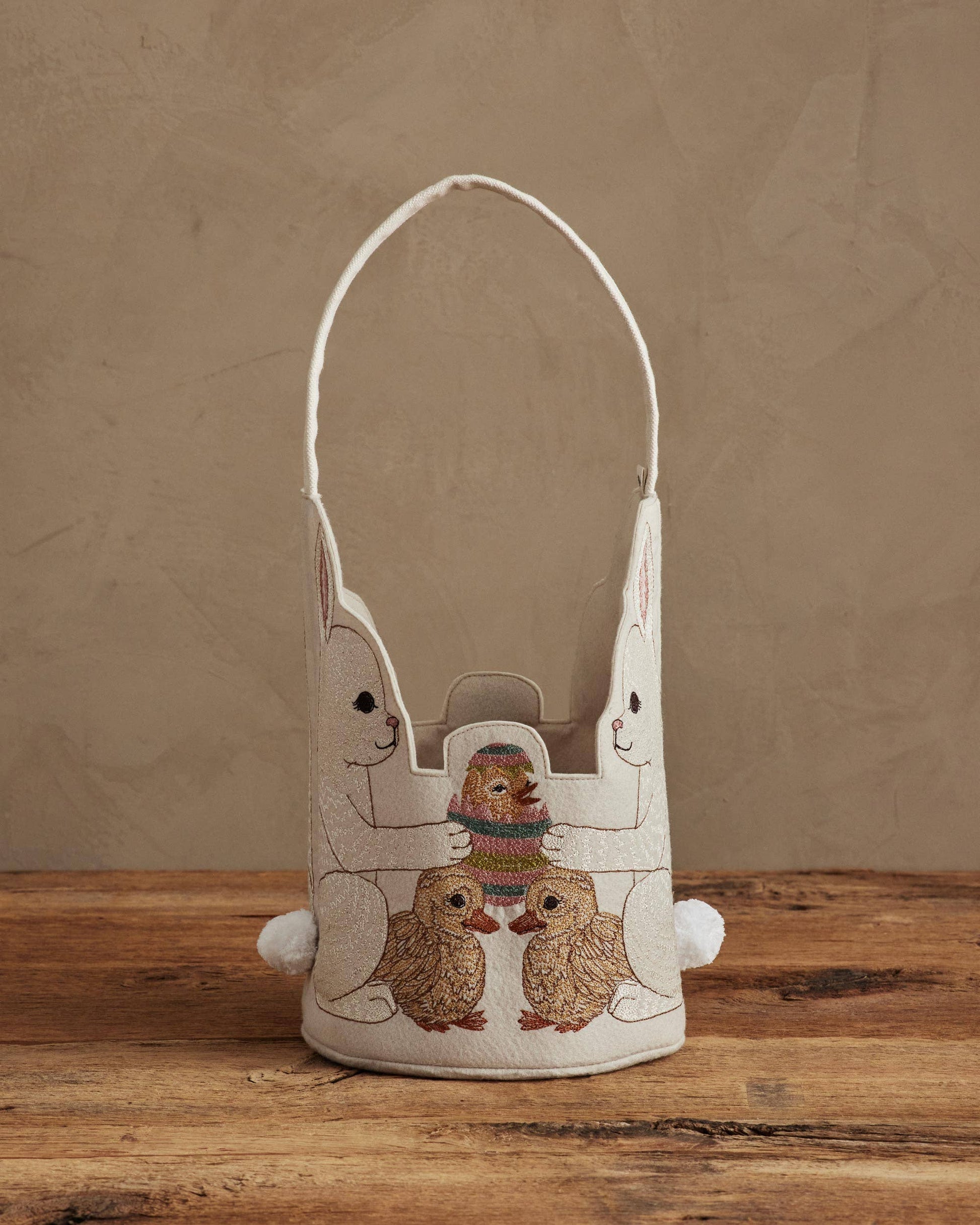 Settle for nothing less than Easter Best with this new basket. A pair of baby bunnies with pom-pom tails hold a prized Easter egg. Out pops a chick from the pastel-striped shell. Rounding out this springtime scene are two downy ducklings greeting their new chick friend. Embroidered on felt, our Easter Friends basket has stitching on all sides and a sturdy canvas handle.