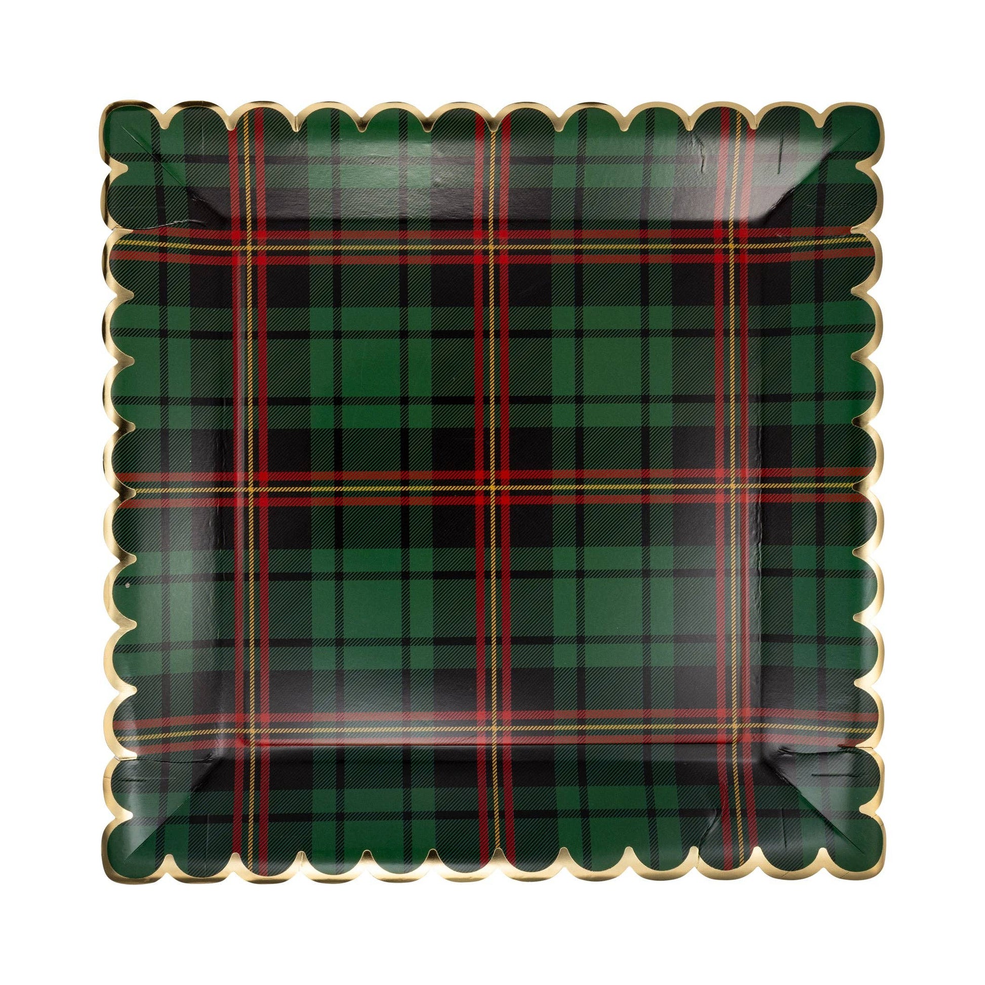 Celebrate the season in style with this Green Christmas Plaid Square Scalloped Plate. Its classic green plaid design brings nostalgic holiday charm to every gathering, perfectly complementing traditional Christmas décor.
