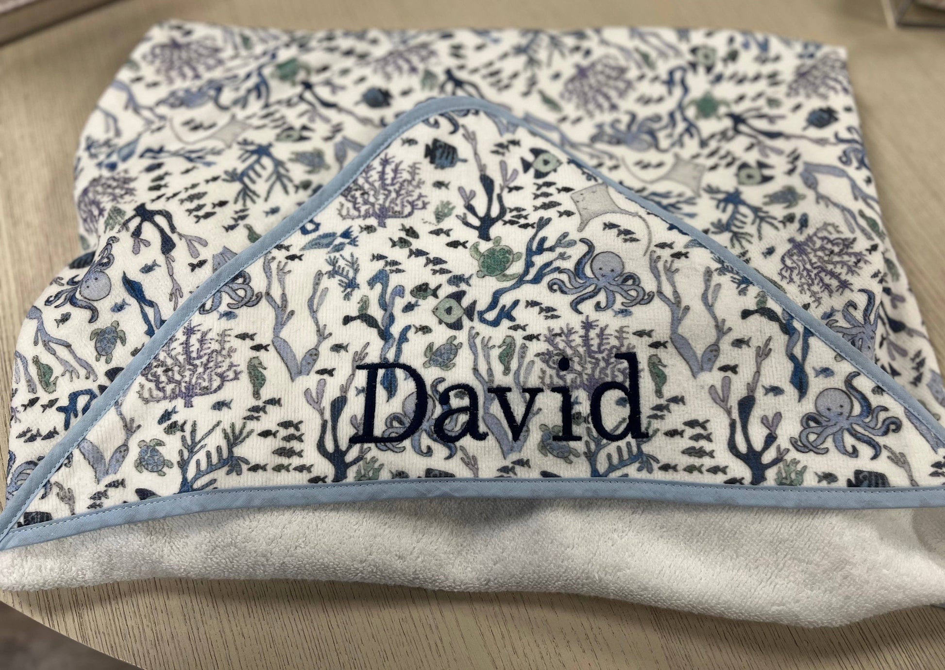 A larger towel with big personality in our Coral Reef print, that can take your little one from infancy through 6 years old!