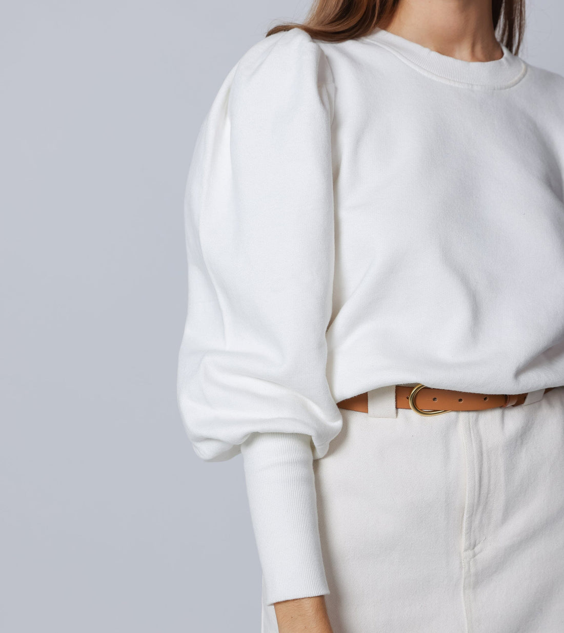 Introducing Cleobella's Core Collection. In organic cotton fleece, The Indi Sweatshirt features puffed high cuff sleeves for an elevated take on loungewear. Whether you're dressing it up or down, it's perfect for staying warm on chillier days. Pair back to any of our bottoms for an chic yet comfortable look.