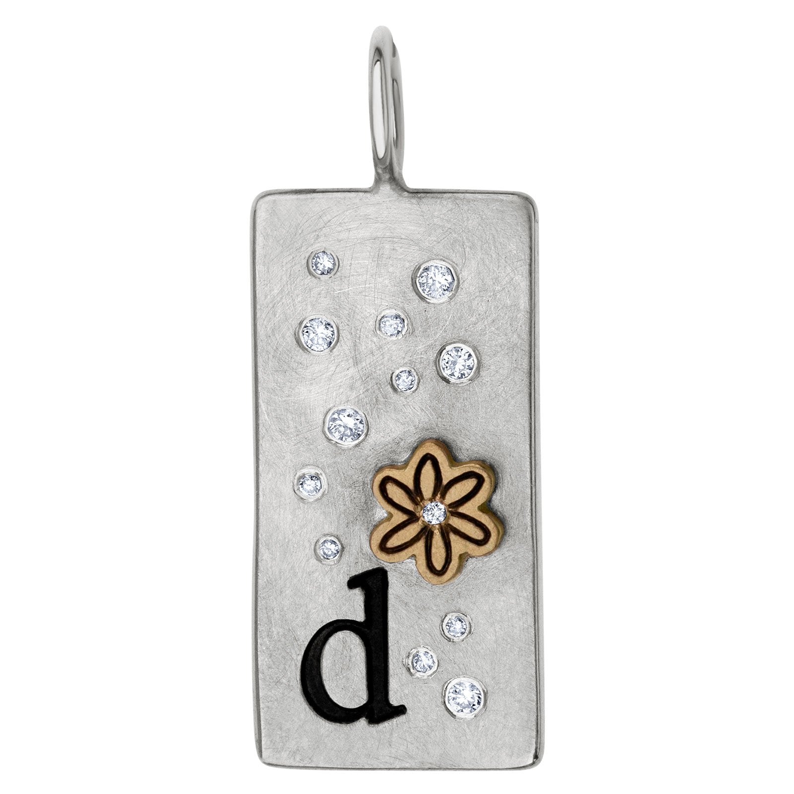 Heather B. Moore small silver ID tag with a stamped raised yellow gold daisy. 1mm white diamond in the center and a scatter of seven 1mm and five 1.5mm white diamonds. Hand stamped with a single initial.