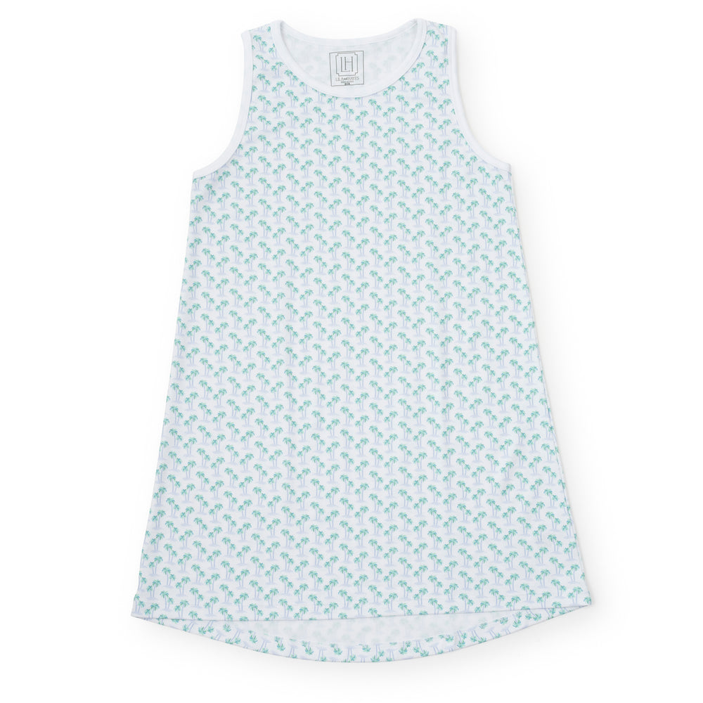 Sleeveless Women's Pima Cotton nightgown with white contrast piping and buttons. Nightgown has a high/low hemline.