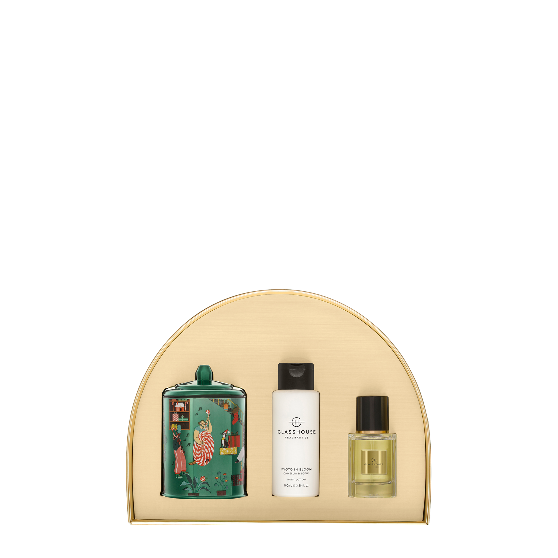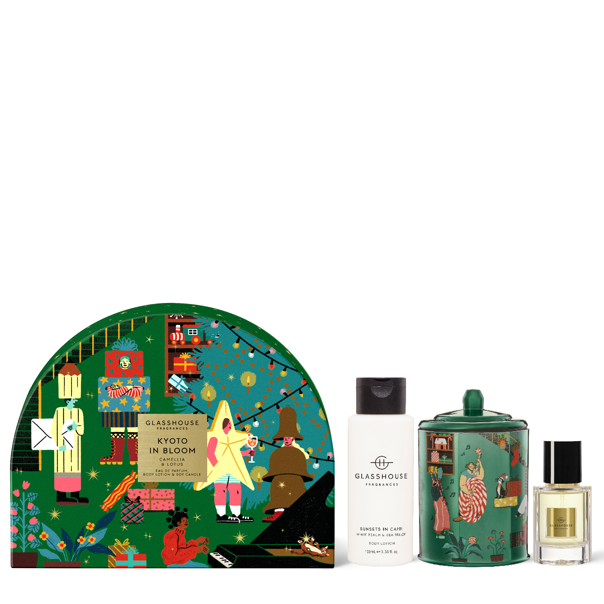 Contains 1 x 1.1 fl oz. Eau de Parfum, 1 x 7.6 oz. Soy Candle, 1 x 3.4 fl. oz. Body Lotion all wrapped up in a festive gift box with joyful illustrations by Michelle Pereira.