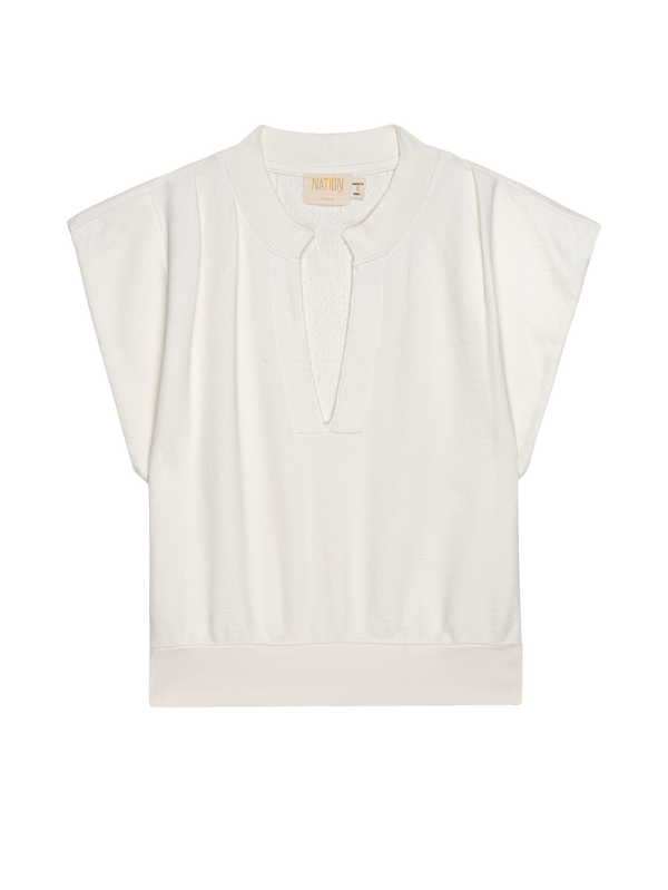 When casual meets chic, you get this sweatshirt top with a daring notch neckline, breezy cap sleeves, and a semi cropped silhouette. Make it a set with the Lincoln pants.