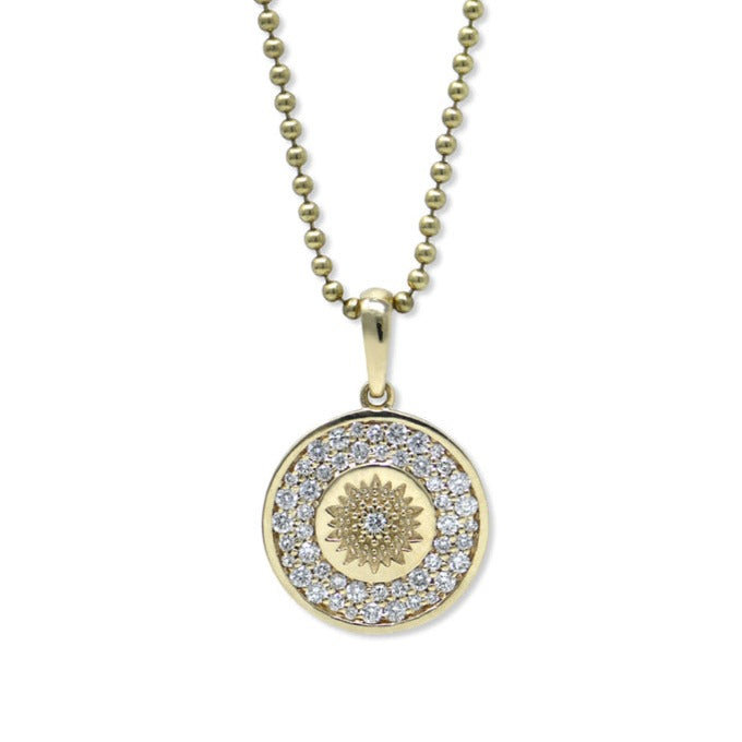 Dangling from a rich ball chain is a gold round pendant engraved with a sun burst and set with a diamond. It is surrounded by a dazzling array of pavé diamonds.