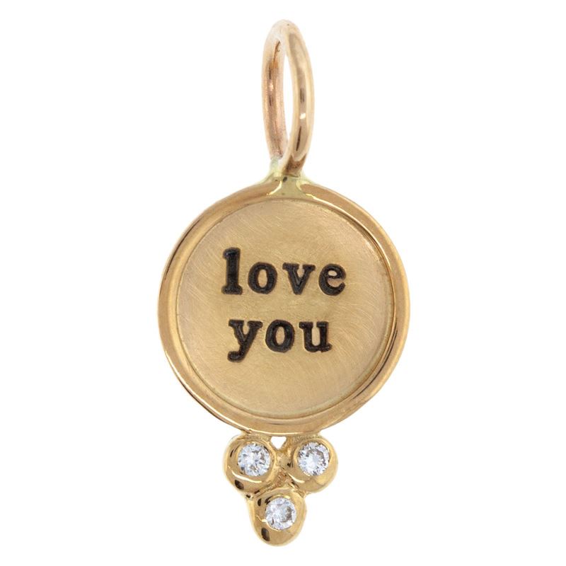 Mini yellow gold round charm with a yellow gold frame and 1.5mm white diamond granules. Hand stamped with “love you”.