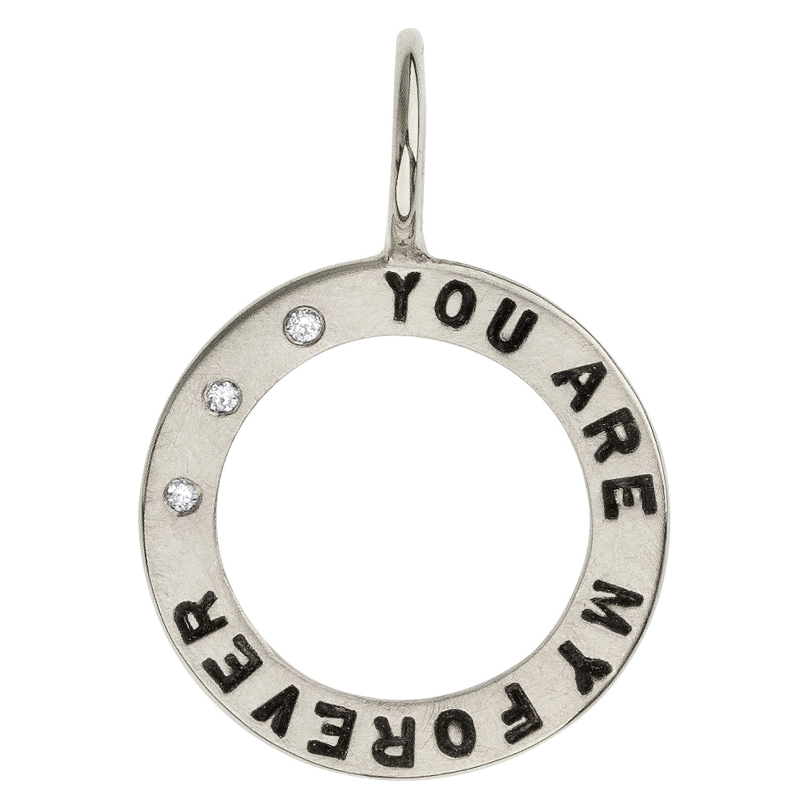 Small silver open circle charm by Heather B. Moore with three 1mm white diamonds. Hand stamped with "You are my forever" with diamond ellipsis.