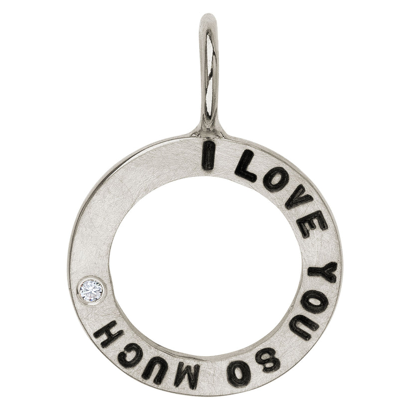 Heather B. Moore. Small silver open circle charm with a 1.5mm white diamond. Hand stamped with "I love you so much" and a small heart on the back.