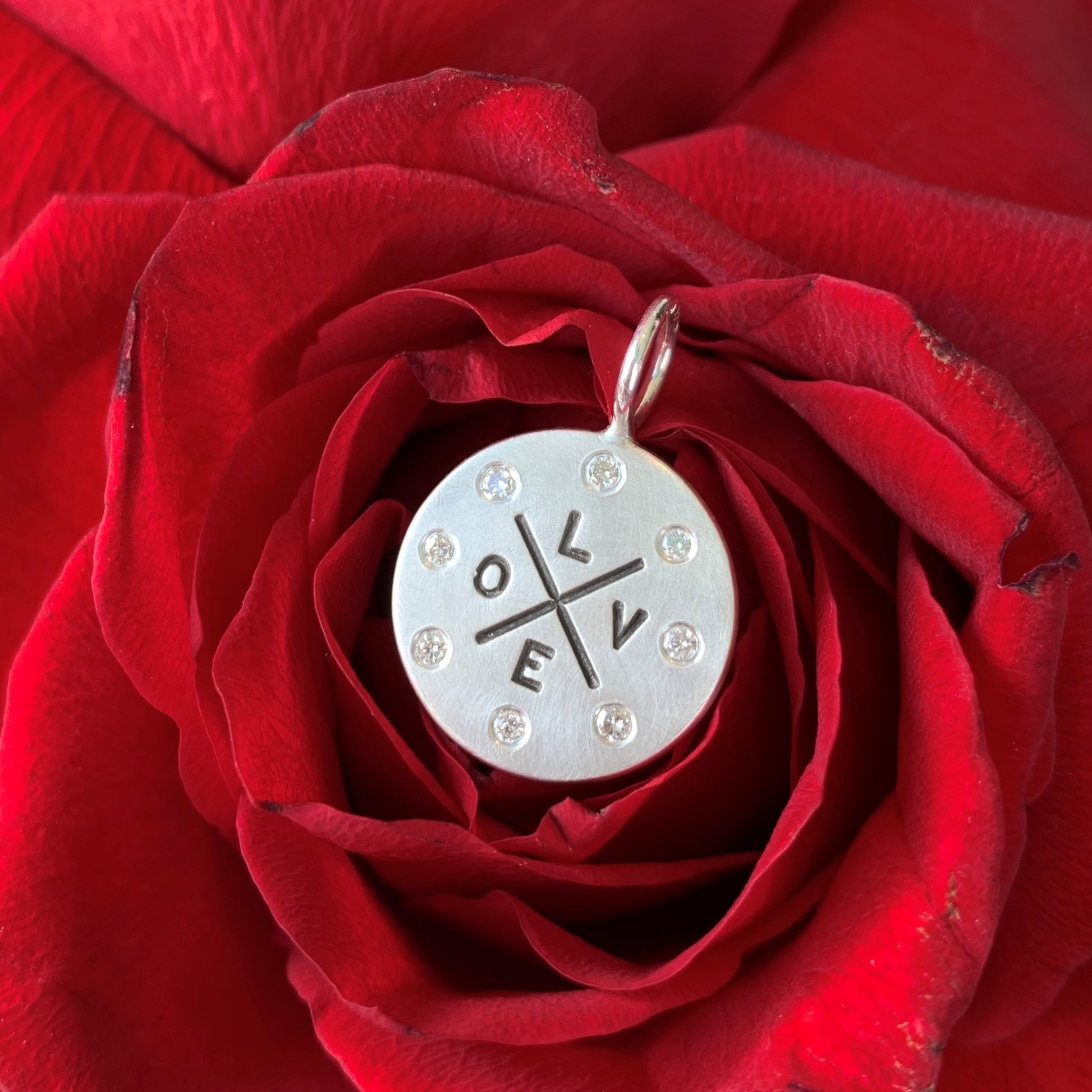Small sterling silver round Heather B Moore charm with a white diamond wreath. Hand stamped with “LOVE” in an X pattern.