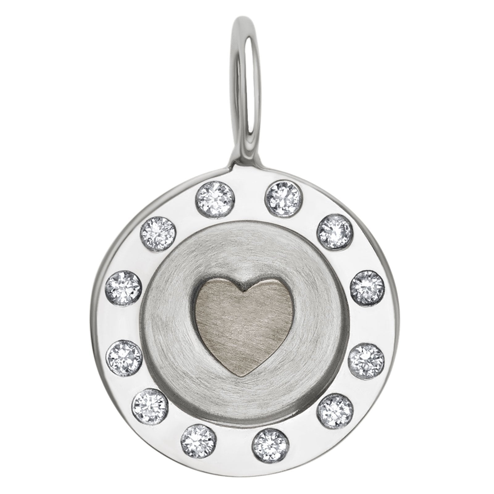 Heather B. Moore mini silver round charm with a silver wide frame with white diamonds and a white gold raised heart in the center.