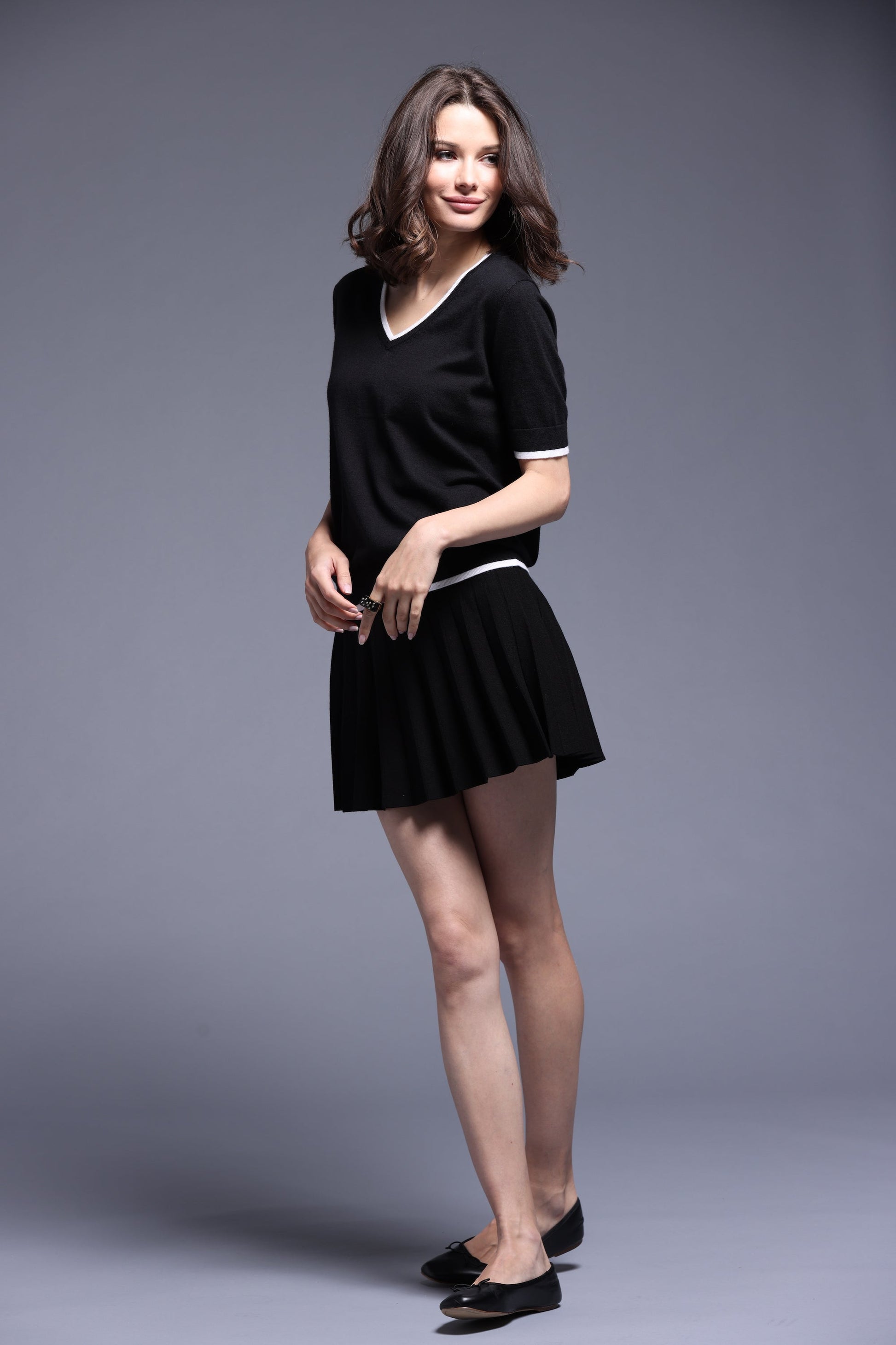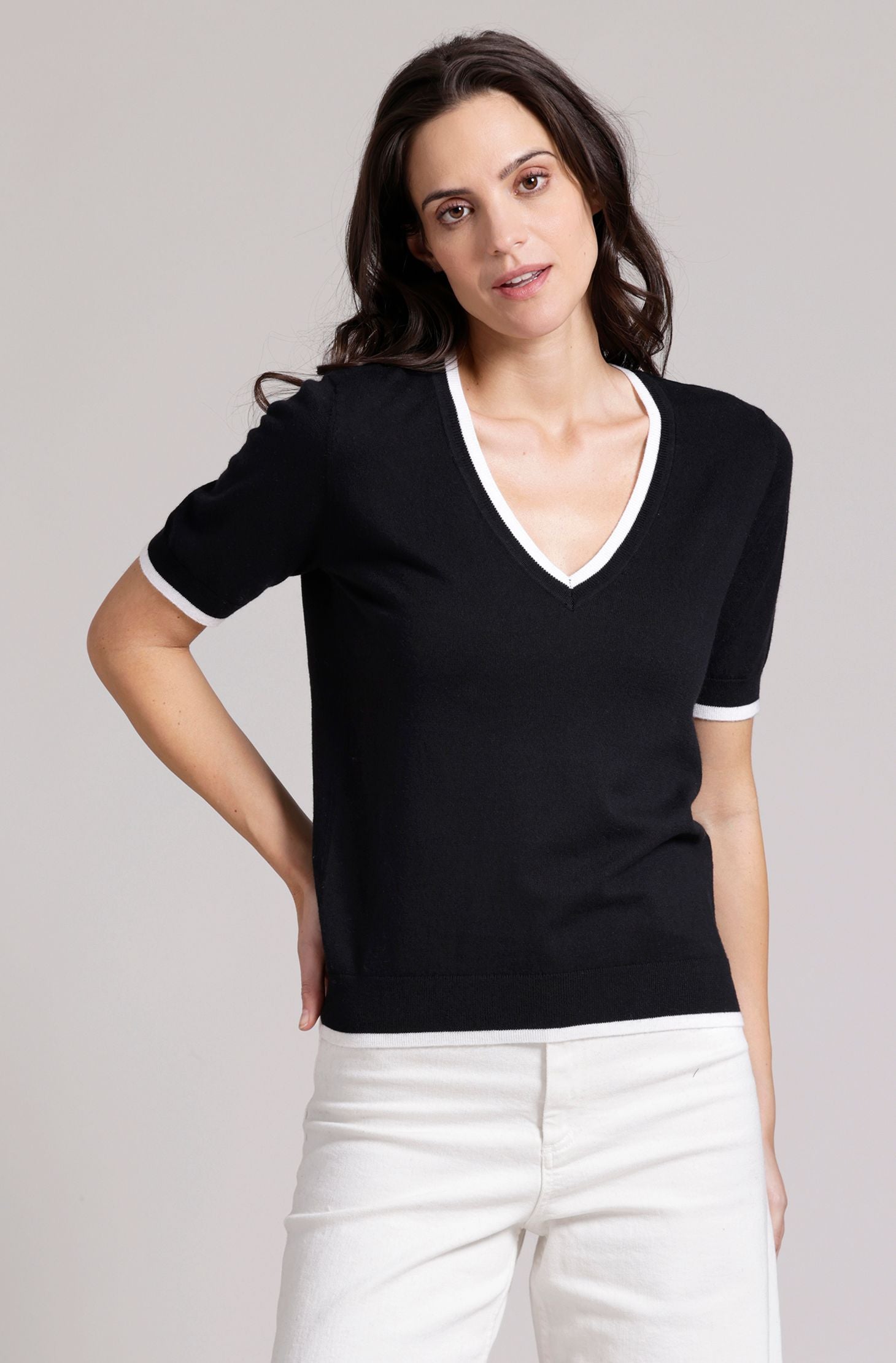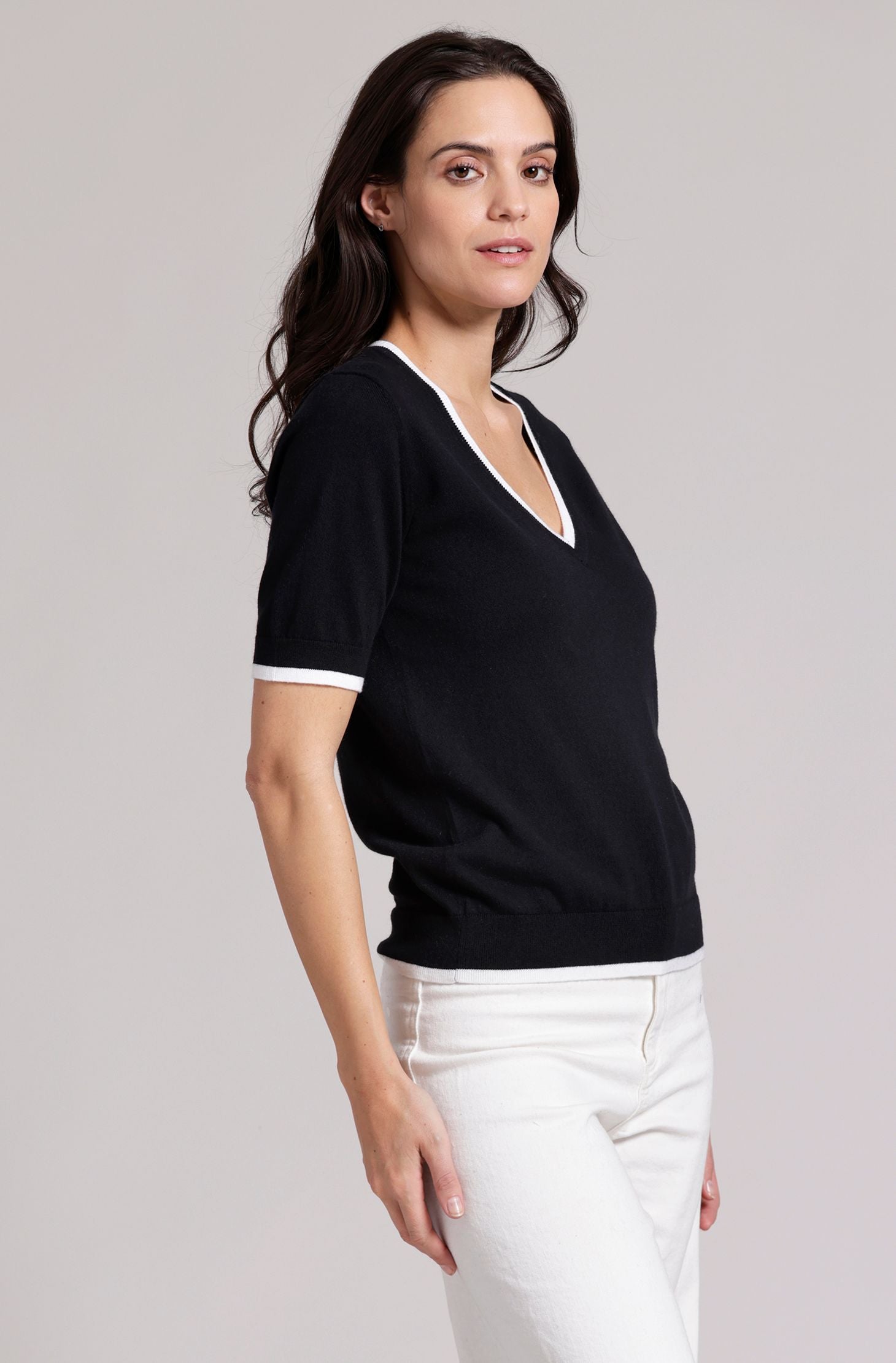 Supima Cotton Cashmere V-Neck Tee with Black/White Tipping