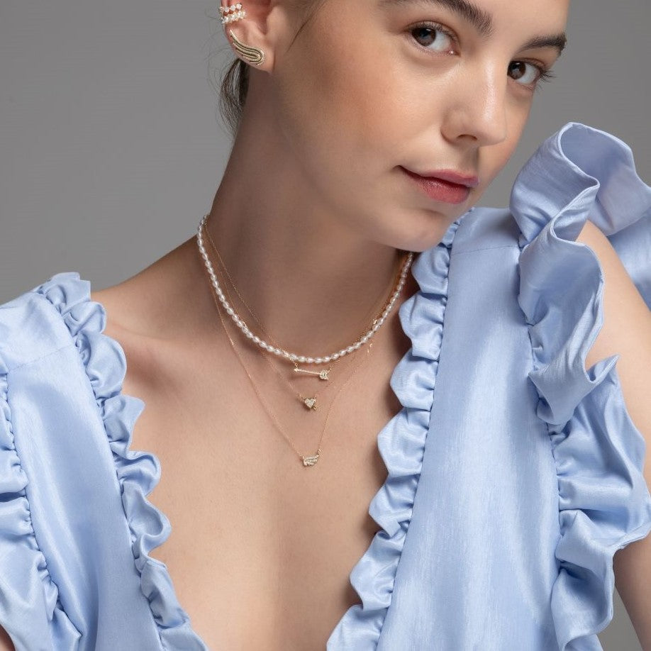 14k yellow gold tiny heart + arrow necklace with hand set pavé diamonds. Adjustable 15/16" chain.