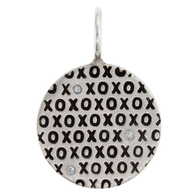 Size 4 silver round charm with three 1mm white diamonds. Hand stamped with “xoxo” repeating.