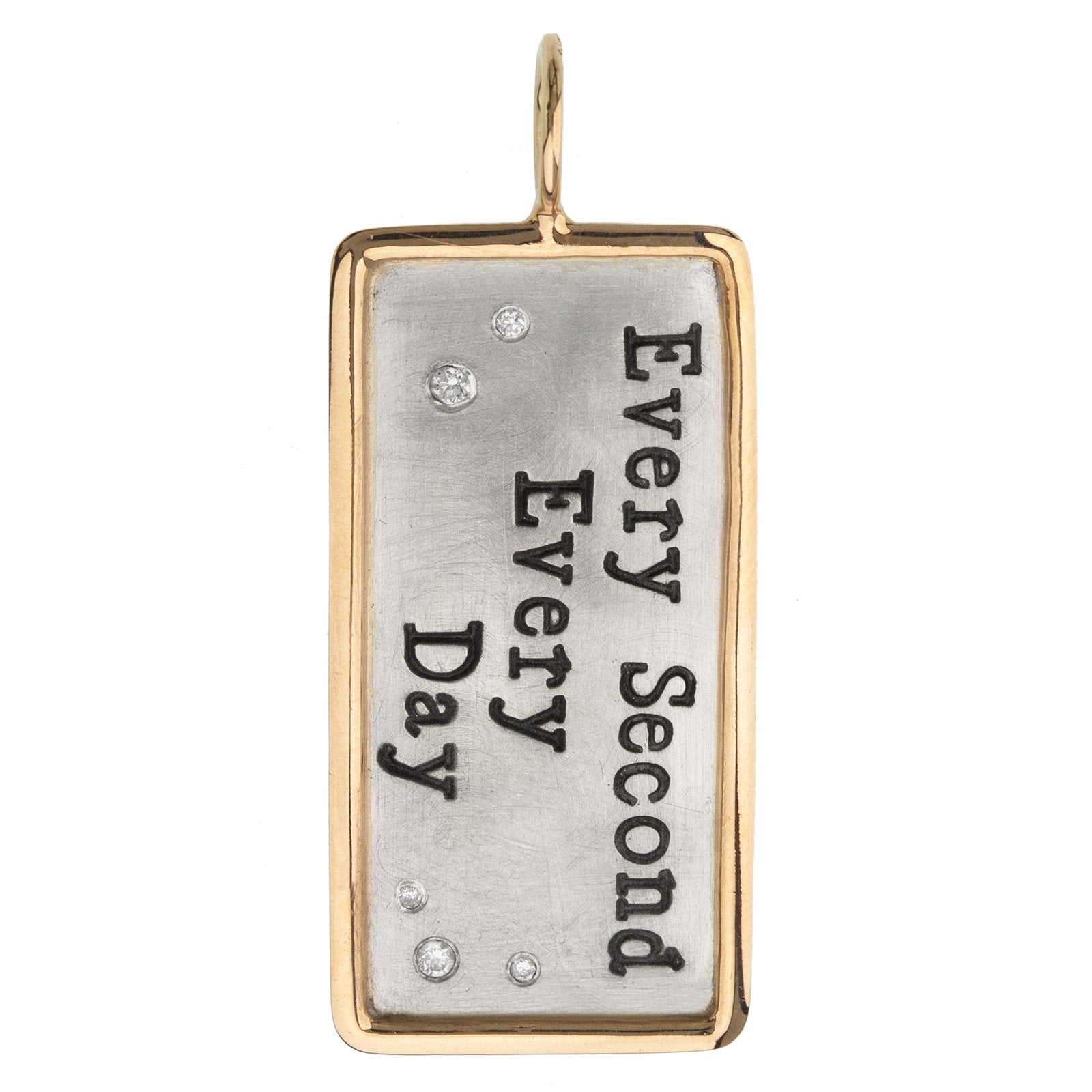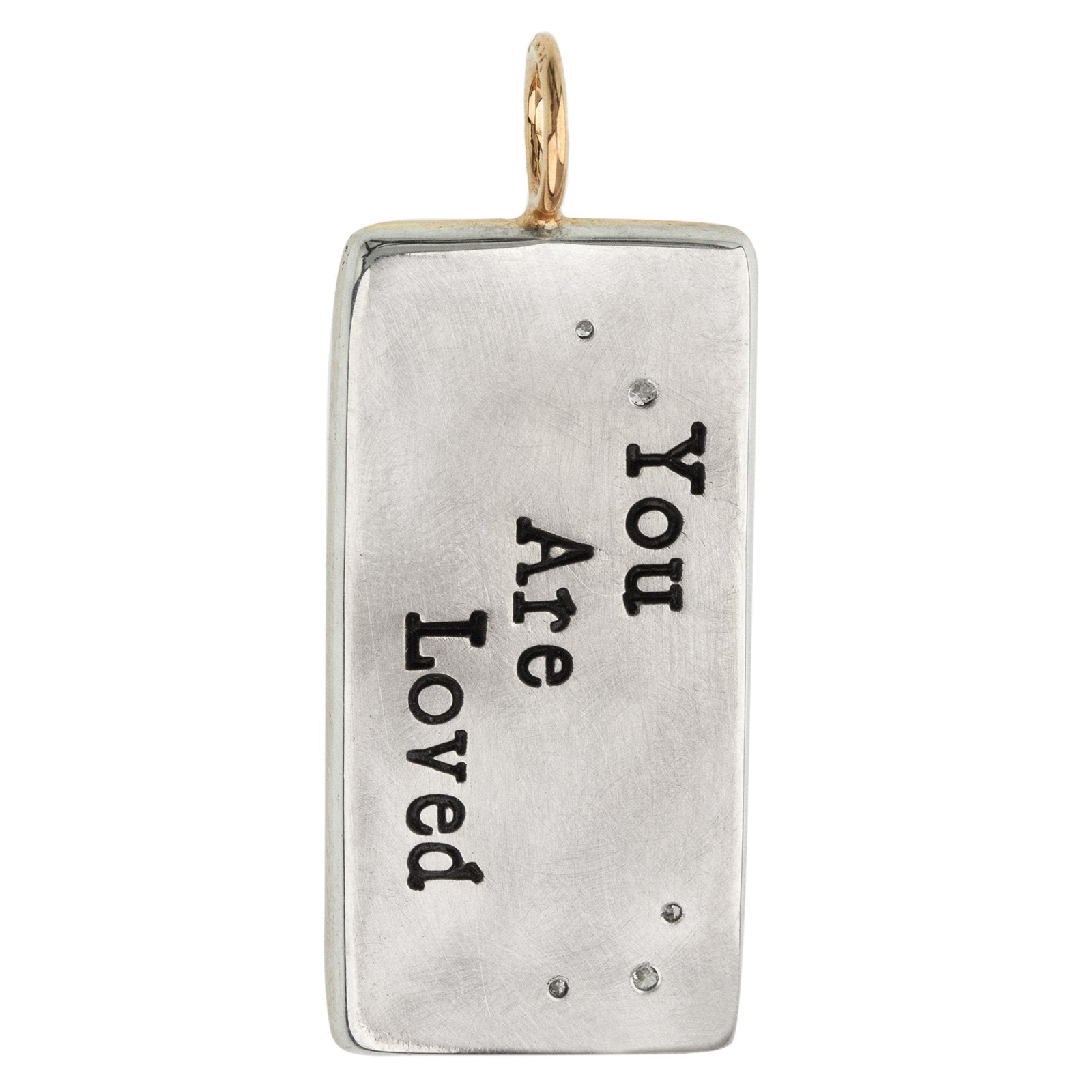 Size 4 silver ID tag with a yellow gold frame, three 1mm white diamonds, and two 1.5mm white diamonds. Hand stamped with "Every second every day" on the front and "You are loved" on the back.